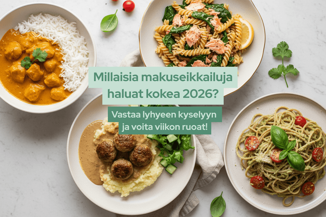 *Arvonta suoritetaan ma 26.1.2026 Palkinto toimitetaan krediitteinä voittajan asiakastilille ja sen arvo on 99 €. 99 € krediiteillä saa ison Ruokaboksin 4:lla reseptillä. Iso boksi sopii 3-5 henkilölle. Tilauksen yhteydessä voi valita itselleen mieluisimmat reseptit.
